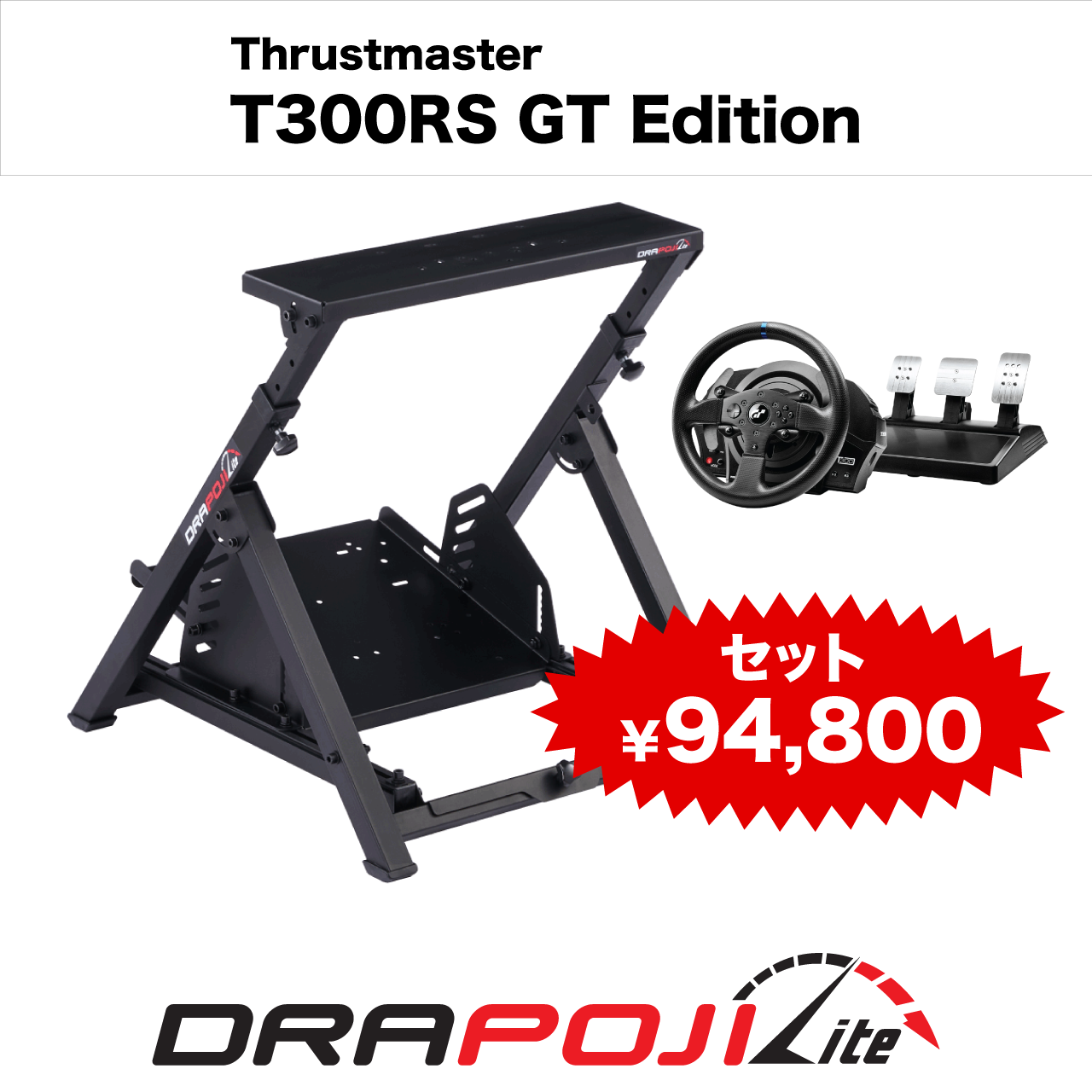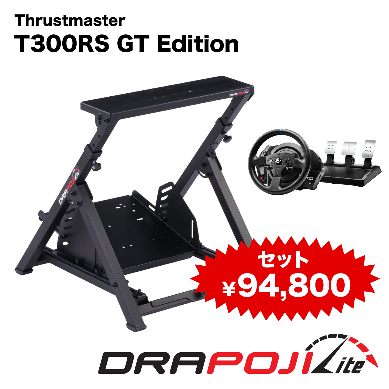 レーシングシミュレーションを「すぐに」「本格的に」「お得に」始めたい方のためのコンプリートパッケージです。DRAPOJI Liteの高剛性フレームと、T300 RS GT Editionの高性能フォースフィードバックが、最高のドライビング体験を約束します。